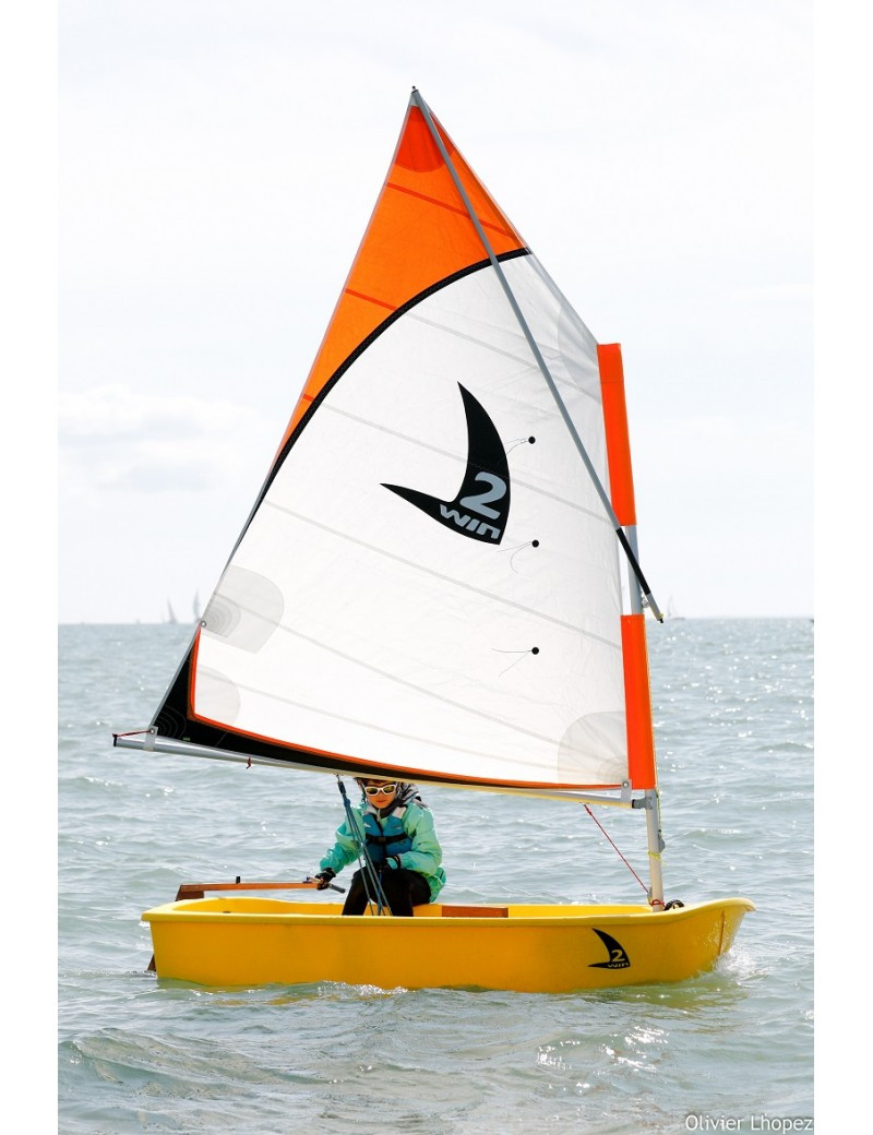 Coque en Polyéthylène rotomoulé tri-couches, gréement aluminium anodisé, voile dacron 170g.